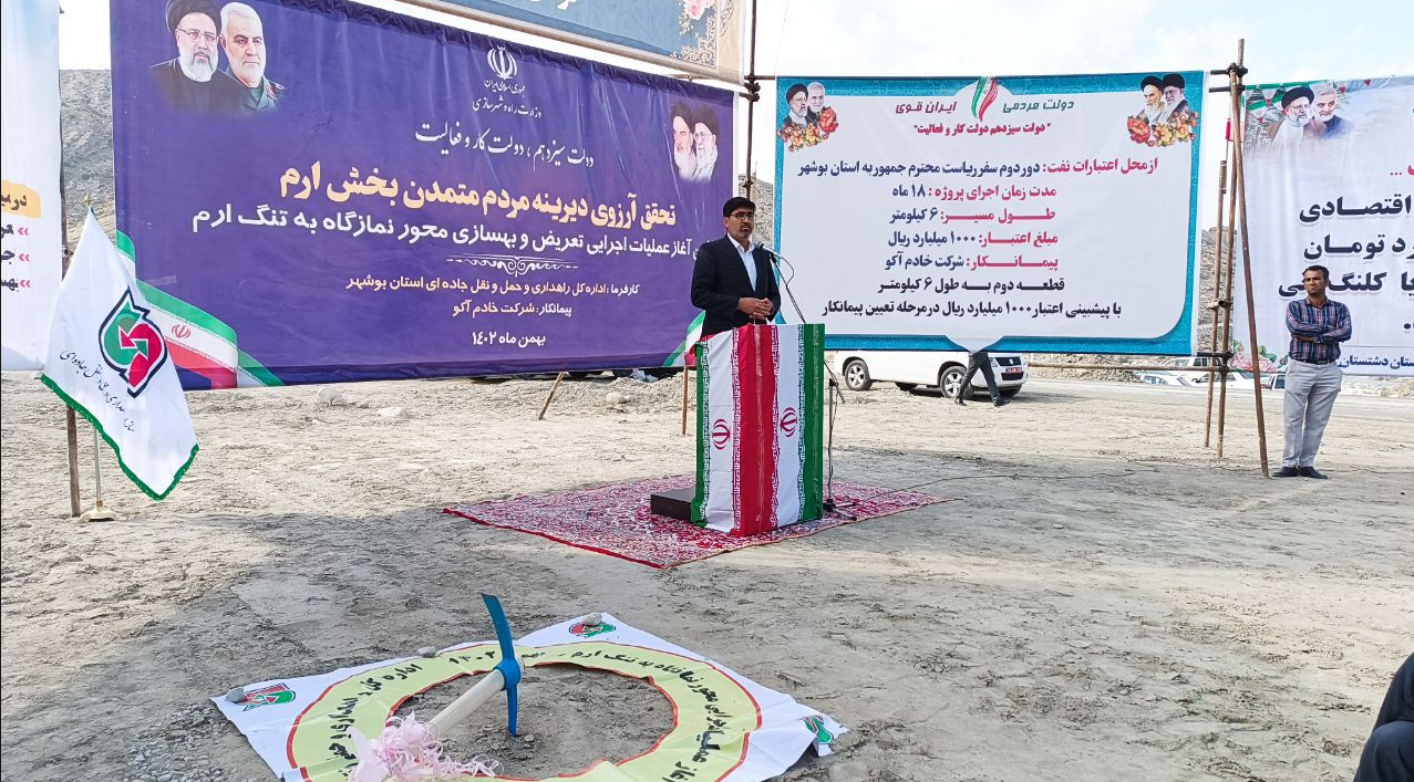 استاندار بوشهر در این آیین اظهار داشت: تعریض جاده نمازگاه- ارم از خواستههای همیشگی مردم بخش ارم و بوشکان بود که اکنون آغاز شده و انتظار میرود در زمان مقرر به بهره برداری برسد.