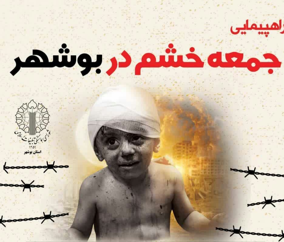 راهپیمایی جمعه خشم در محکومیت کشتار خونین و وحشیانه مردم مظلوم غزه و تداوم بربریت رژیم آپارتاید صهیونیستی فردا در بوشهر برگزار میشود.